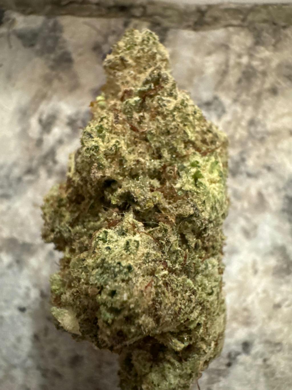 - Appearance: Frosty, gold-green buds with orange pistils, dense resin, and sparkling trichomes