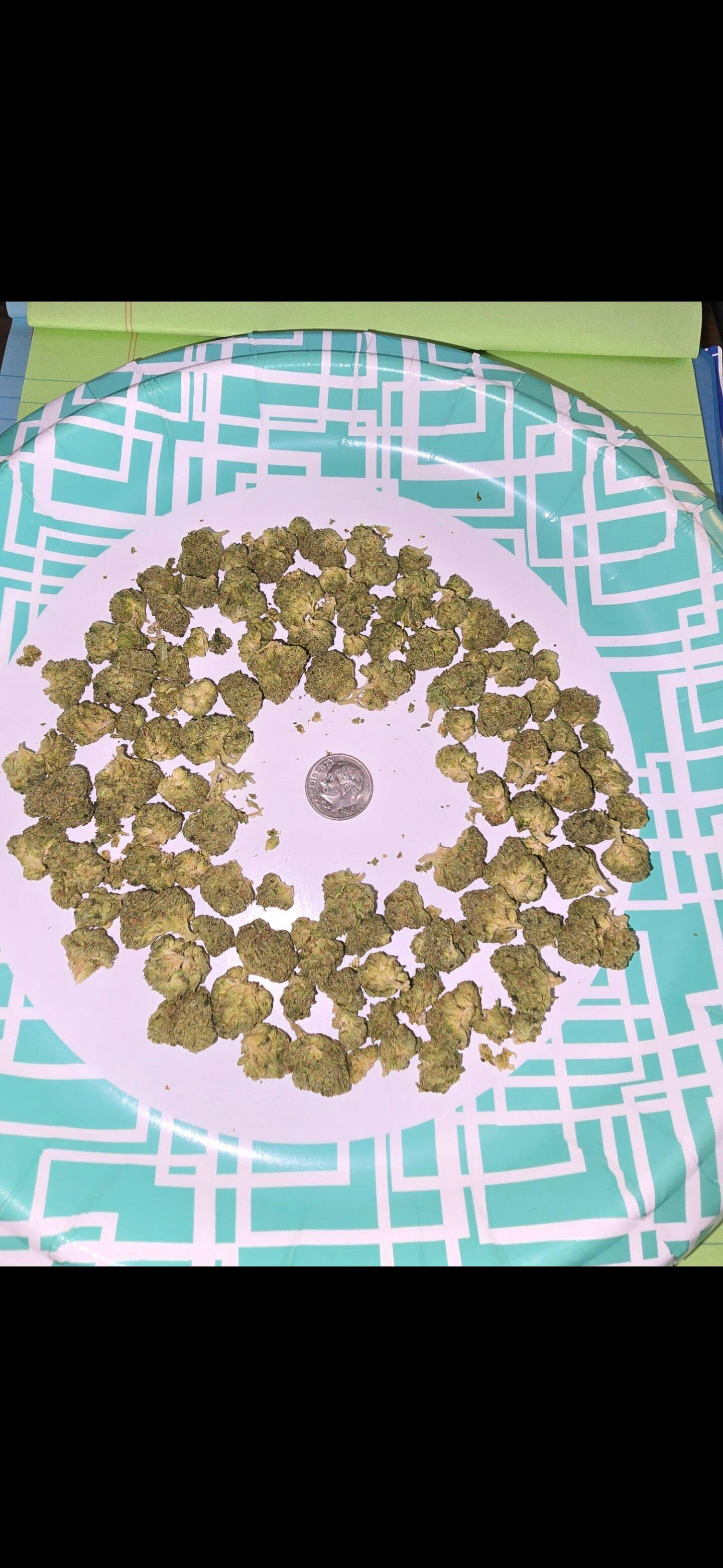 - Appearance: Dense green buds with orange hairs and sparkling trichomes